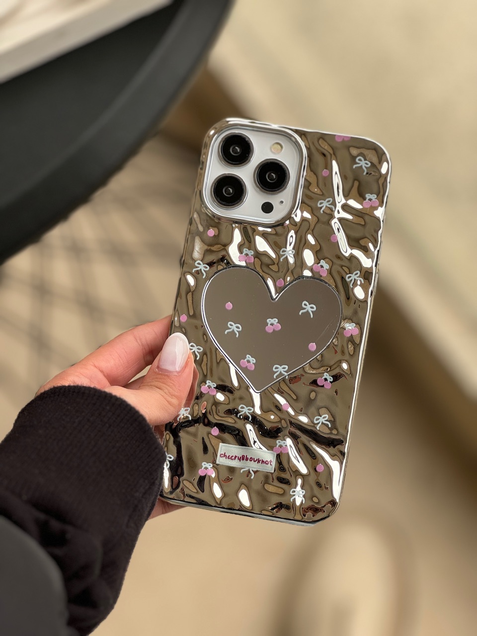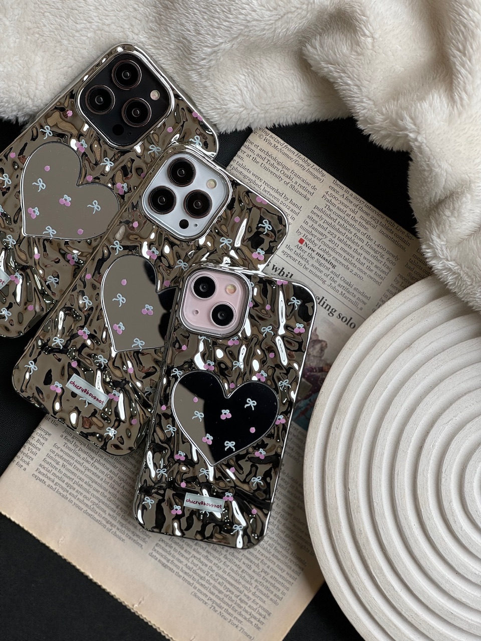 چرا کاور آیفون 12 و 12 پرو طرح قلبی کرومی نقره ای آینه ای گیلاس و پاپیون؟